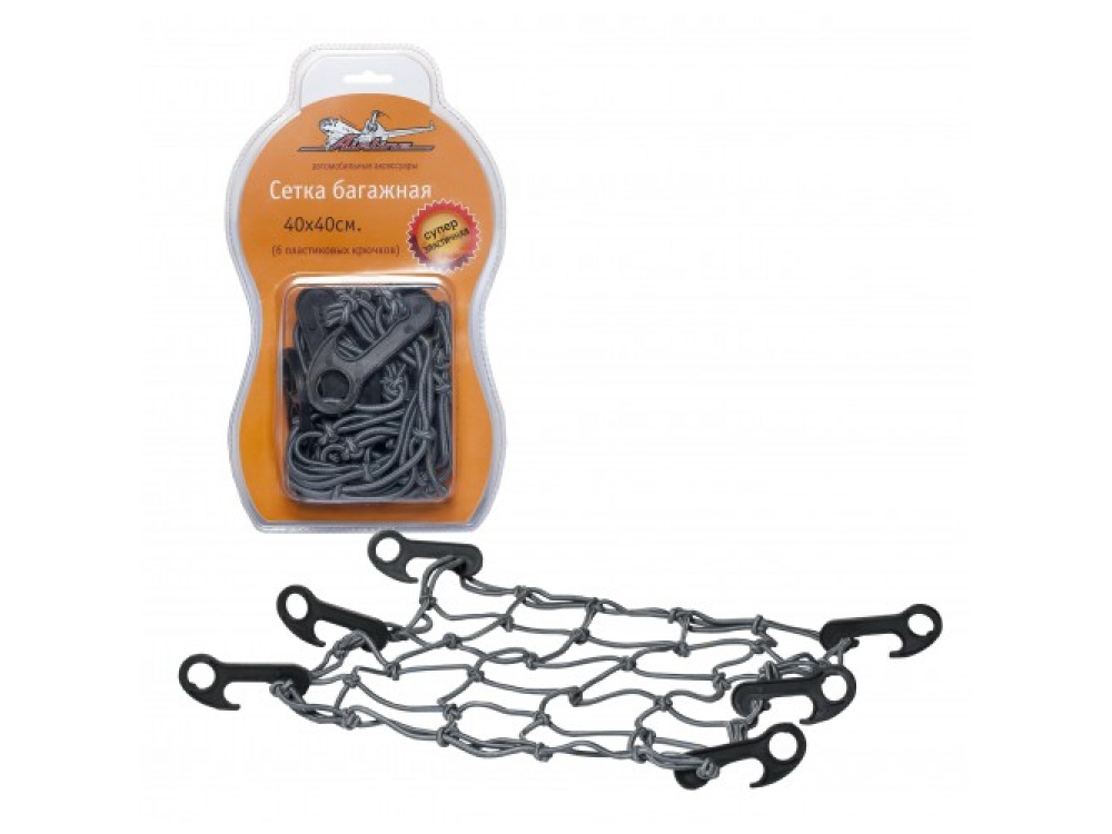 Сетка с габаритными показателями 40х40 см предназначена для фиксации багажа малого размера в салоне автомобиля или на борту малогабаритной транспортной техники. Крепежом для багажной сетки служат 6 крючков, изготовленных из прочного пластика. Специальный материал, из которого изготовлены жгуты сетки, обеспечивают изделию эластичность и надежность.